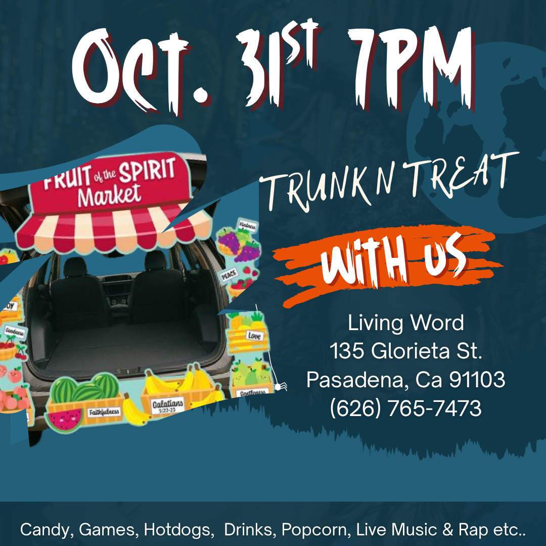 Join Us For Our Trunk N Treat event providing a safe place for children in the community. There will decorated cars with candies, hot dogs, drinks, live music etc.